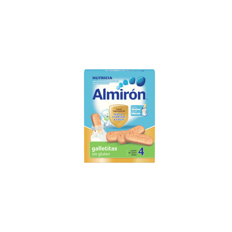 Las galletitas son aptas para la preparación del biberón a los 4 meses Comenzar disolviendo una galleta en el biberón aumentando posteriormente el número de galletas a disolver según las necesidades del bebé o las indicaciones A partir de los 8 meses se le puede proporcionar enteras para favorecer la autonomía del bebé ya que son adecuadas para las sujete fácilmente Una galleta equivale a una cucharada de cereales sin gluten almiron (aprox 6 g) Antes de introducir nuevos alimentos en la dieta del bebé siga siempre las indicaciones de su pediatra Después de cada utilización cierre bien la bolsa Una vez abierta la bolsa debe consumirse en el plazo de 3 semanas A los 4 meses no se recomienda dejar masticar las galletas al bebé únicamente a partir de los 8 meses para favorecer su autonomía Almidón de maíz azúcar almidón de patata aceite de palma leche desnatada en polvo lactoalbúmia sirope de fructosa carbonato cálcico aroma gasificantes (bicabonato de amonio y bicarbonato de sodio) emulgente (lecitina de soja) sal vitmaina C (ácido ascórbico) vitmainas (niacina vitamina B1 Vitamina B6 vitamina B2) lactato de hierro Por 100 g: Vitamina C (Ácido Ascórbico): 35 mg Vitamina B1 (Tiamina): 05 mg Vitamina B2 (Riboflavina): 03 mg Vitamina B3 (Niacina): 55 mg Vitamina B6 (Piridoxina): 04 mg Calcio: 310 mg Hierro: 5 mg Galletas sin gluten elaboradas a base de cereales con un aporte de hierro vitaminas y calcio Estan indicadas a partir de los cuatro meses para disolver en el biberón y con más de ocho meses se pueden consumir enteras
